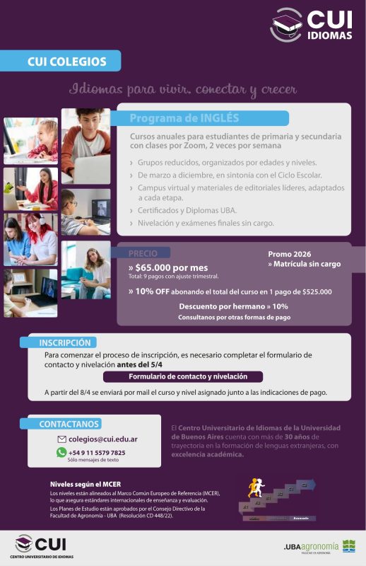 El Centro Universitario de Idiomas extiende el alcance de su propuesta de Cursos de inglés a estudiantes de nivel primario y secundario, en respuesta a las solicitudes de nuestros estudiantes y entendiendo la importancia del aprendizaje de idiomas a temprana edad.